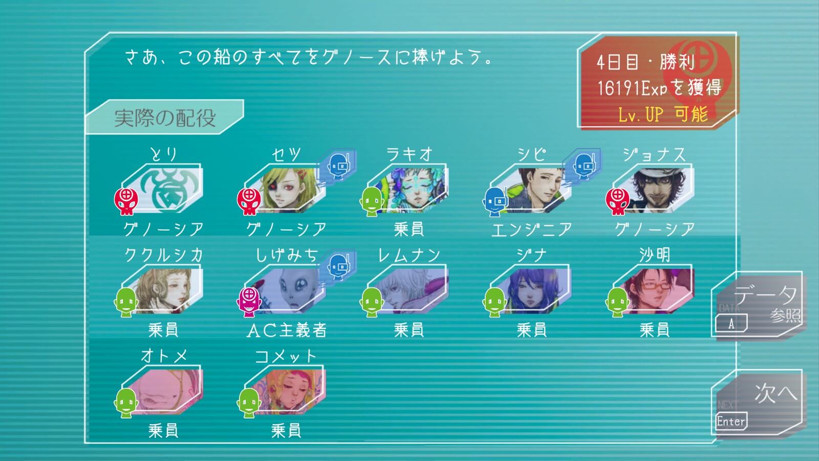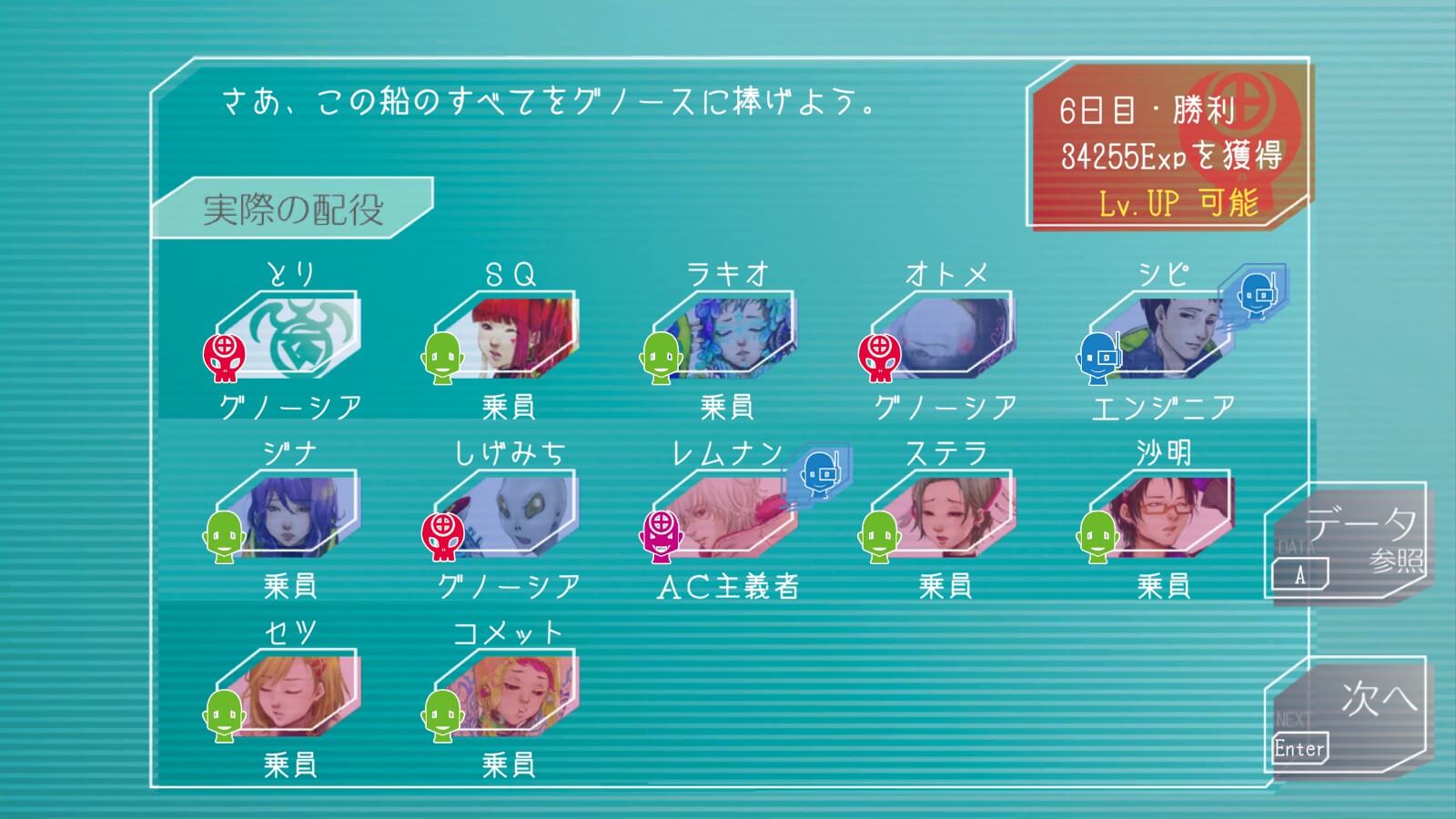 動きすぎたのか疑い自体は飛んでこないのに票が集まっちゃてやべ…と思ってからの土下座が通って、翌日真エンジニアの夕里子がククルシカにグノーシア宣告しての逆転勝利!あ、ありがとう夕里子さま…。
